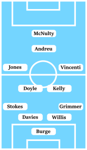 Essentially Robins has left himself with a selection between either Tony Andreu or Stuart Beavon to play in just behind McNulty, and either Duckens Nazon or Peter Vincenti out wide. Personally, I think we’d look better with Nazon playing in behind McNulty, although there is an issue of who is there to hold the ball up, and with Andreu playing in a deeper central position instead of one of Kelly or Doyle. However, Robins is a pragmatic manager, so I don’t think the starting XI for this game is going to be as risky as the one I’d like to see.