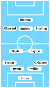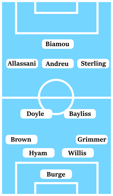 A 4-2-3-1 looks to be the system that gets the best out of Tom Bayliss and Tony Andreu, either with Bayliss playing in central midfield with Andreu ahead of him or Bayliss floating around from a wide position. Fitness concerns with Abu Ogogo and Liam Kelly could see Bayliss played in his natural central midfield position, while there looks to be an open slot in the side on the right wing which either Dujon Sterling or Jordy Hiwula can fill with Reise Allassani cutting in from the left flank.