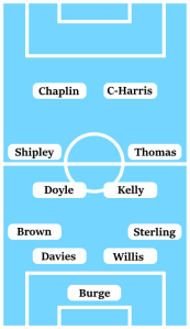 A recall for Doyle could well see a return to the 4-4-2 system that we have deployed for much of the season. Unless shunted to the wing, Doyle’s return may call for Tom Bayliss to be taken out of the side – as unthinkable as it is, it may help him in the medium-to-long-term to avoid burning out. A 4-4-2 would also probably make it unlikely that Reise Allassani would be rewarded for an intriguing cameo last week with a place in the side, with the studier Jordan Shipley likely to come in on the left-wing.