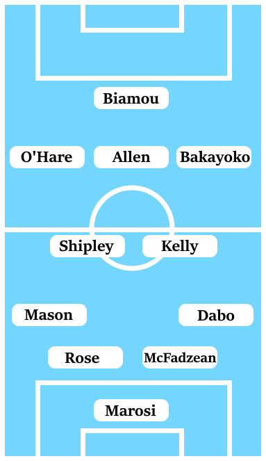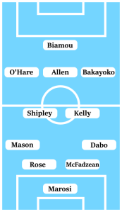 Just who is deployed alongside Liam Kelly in central midfield is an area for competition. It is not known the extent of the knock that kept out Liam Walsh from Saturday’s game, while Zain Westbrooke struggled as Kelly’s midfield partner in the first-half. Via a process of elimination, that probably sees Jordan Shipley return to the starting line-up, unless Callum O’Hare is played over Jamie Allen as the central attacking midfielder and Allen moves into that central midfield spot alongside Kelly.